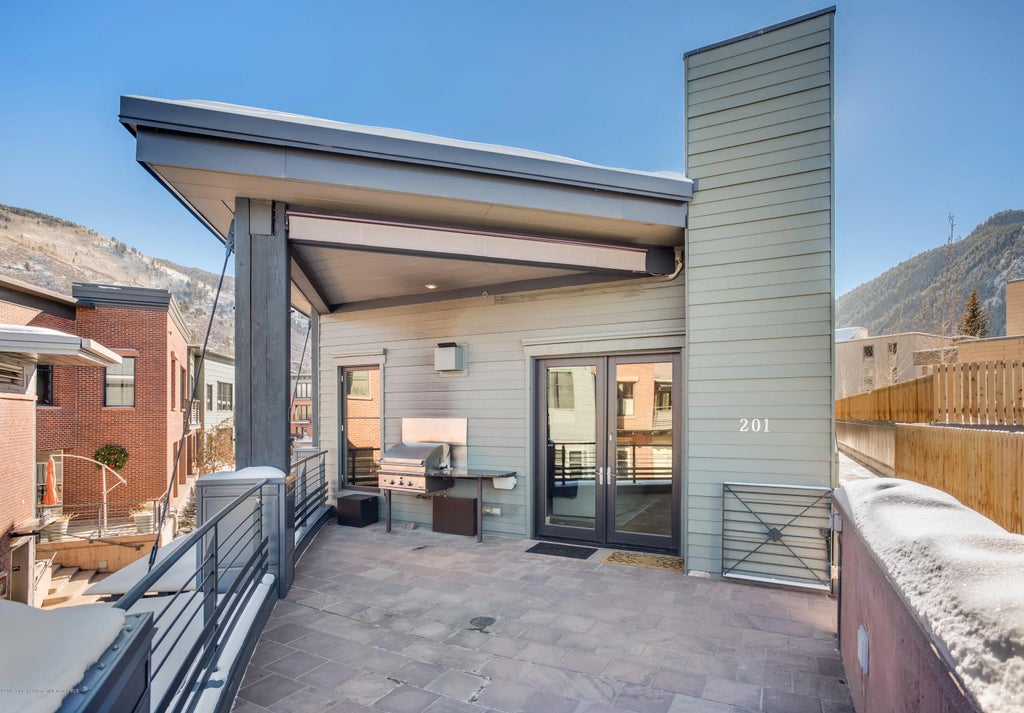 This spectacular corner unit has a unique location off Main Street with a private entrance and easy direct access to Aspen's core. This property offers high-end contemporary furnishings and finishes featuring reclaimed hardwood floors, stainless steel appliances, air conditioning, gas fireplace and granite countertops. The spacious open floor plan offers one level living and is perfect for family gatherings or entertaining guests. The private terrace is equipped with a built-in grill, electronic awning for additional shade and views of Red Mountain and Rio Grande Park. The unit enjoys a private underground 2 car garage directly across from the elevator - easy to navigate garage to your front door. The Roaring Fork River, John Denver Sanctuary and Theater Aspen are all in your backyard.