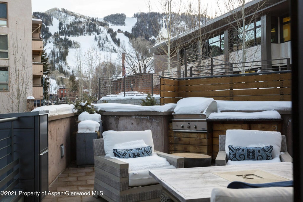 Beautifully remodeled core condo with views of Aspen mountain located steps from Main Street and across from the Rio Grande Park. Gorgeous, open living area with limestone gas fireplace flows seamlessly into a spacious kitchen and dining area with seating for six. Gourmet kitchen designed for the cooking enthusiast featuring top of the line stainless steal appliances, and an ample amount of storage. Luxurious master suite enjoys beautifully appointed master bath featuring steam shower, double vanities, soaking tub, and walk in closet. Overly spacious outdoor patio includes built in grill, firepit, cozy seating area, and direct views of Aspen Mountain.