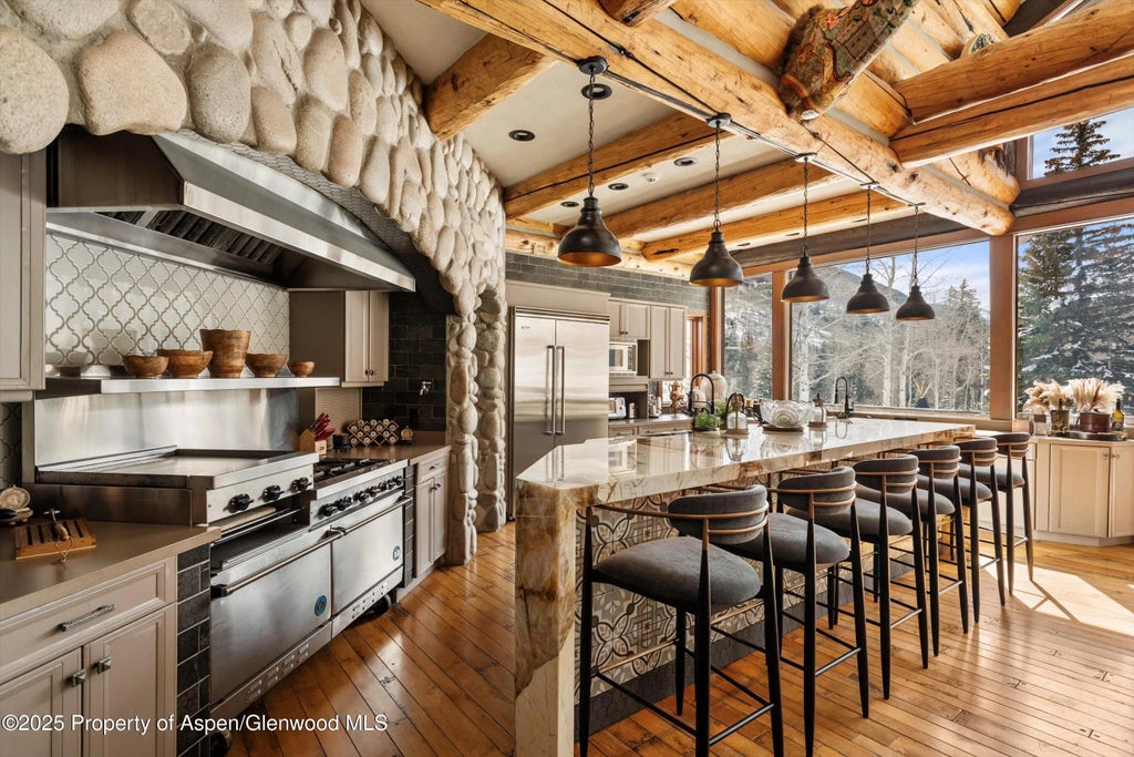 A great room with vaulted ceilings seamlessly flows into the upgraded kitchen with top-of-the-line appliances and finishes. From the walk-in pantry to the commercial griddle and marble breakfast bar, you or your private chef will love cooking here.