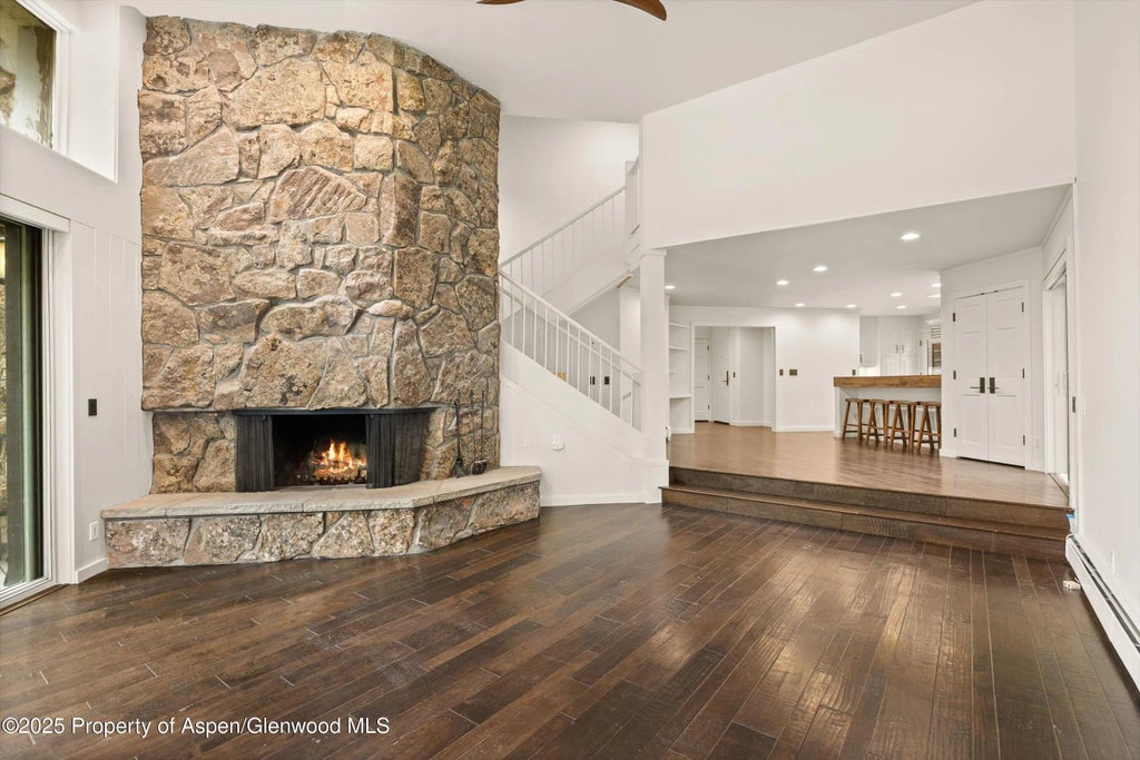Tucked among the aspen trees in a peaceful, natural setting, this beautifully updated 3-bedroom, 3-bath home offers privacy, space, and comfort just minutes from downtown Aspen. The interior features high ceilings, abundant natural light, and a fresh remodel with contemporary finishes throughout. The living area includes a cozy fireplace—perfect for Aspen's cooler months—while large windows bring the outdoors in.
