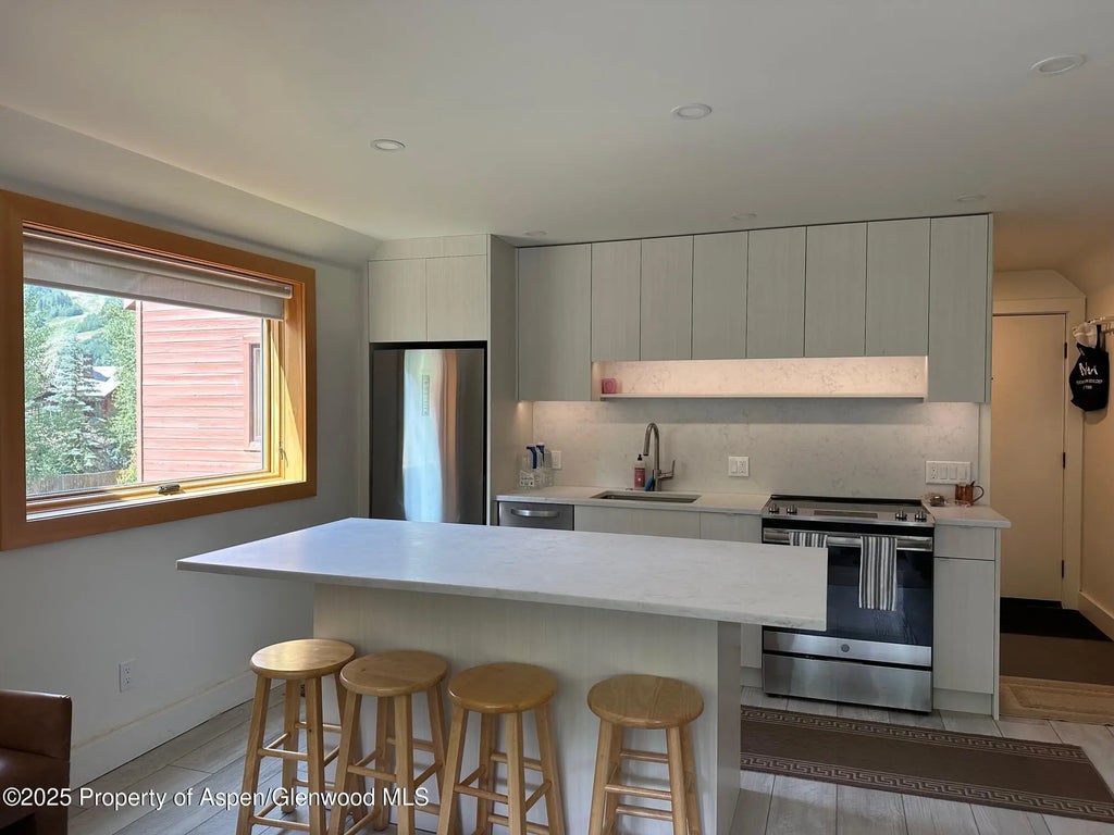 An east-facing balcony captures sunrise views over Smuggler Mountain, while a large picture window frames a full, unobstructed view of Aspen Mountain and brings in all-day southern light. Trails are right outside your door, offering immediate access to Aspen's outdoor lifestyle.