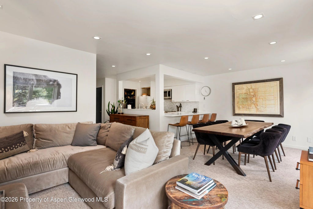 This contemporary villa offers an exceptional retreat for both golf and ski enthusiasts, ideally situated along the golf course with expansive views of the surrounding ski slopes. The light-filled main level features a crisp white chef's kitchen with Bosch appliances and a walk-in pantry, flowing seamlessly into the dining area and an inviting living room anchored by a wood-burning fireplace. An expansive deck extends the living space outdoors, providing an ideal setting for dining and entertaining. The upper level includes three well-appointed bedrooms and a generous loft that serves as versatile living or work space. The primary suite is highlighted by a fully remodeled en-suite bathroom, a walk-in closet, and a private deck perfectly positioned to capture mountain sunsets. Tasteful furnishings and a designated carport complete this refined offering.